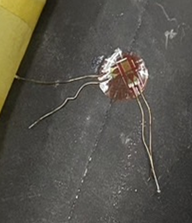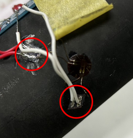 5.あとはひずみゲージ,基板,ホイートストンブリッジをリード線ではんだ付けしてつなげれば完成です。ひずみゲージにはリード線が断線しないように上から透明の保護テープを張りました