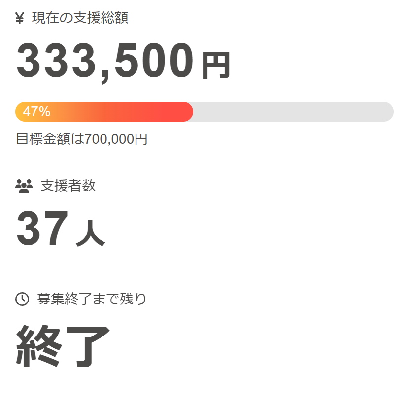 9/03~11/20の間で募集を行い、37名の方からご支援いただきました。