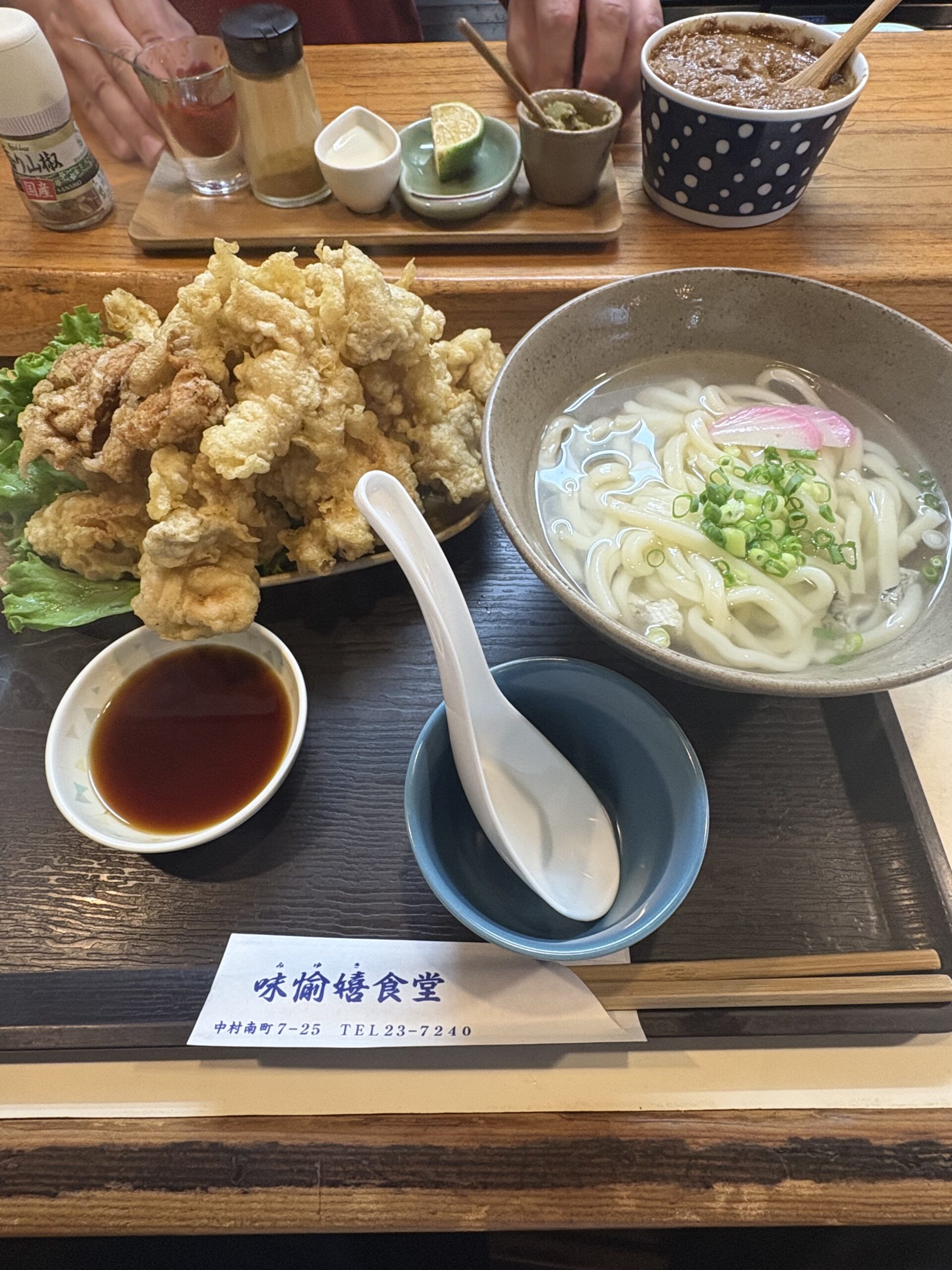 しばらくシャワーだけの生活が続いていたこともあり、身体の疲れが溜まっていたので、この日は休息日にしました。温泉で体の疲れを回復させ、宿の方に勧めてもらった「とり天うどん」を食べに出かけました。お店方のご厚意でとり天を2倍以上の量を頂きました。ありがとうございました。