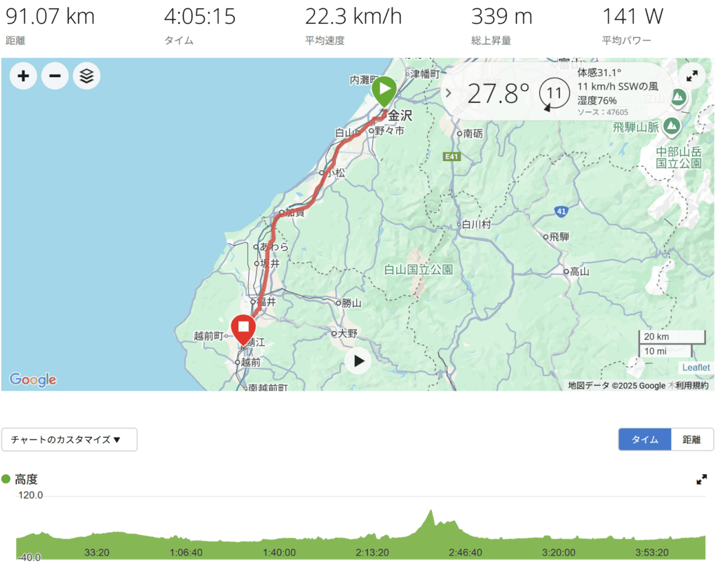DAY8は石川県 金沢市を10時頃に出発しました。午前中はずっと雨が降る予定でしたが、ちょうどチェックアウトの時刻に止んでくれたので助かりました。この日は昨日の疲れを見越して100kmほどしか走らないルートに変更しました。8日目までは、事前に計画していた出発地、到着地の予定をしっかり達成できていました。
