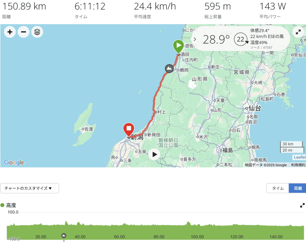 その後は無事に新潟市に到着すると思いきや、自分が信号待ちしているところに三輪が突っ込んできて接触してしまい、ディレイラーが曲がってしまいました。ギアの一番外側とその外を入ったり出たりして、ほぼ走行不能になってしまいました。壊れてしまったことと、残り5~10kmほどで平均時速も25km/hを超えそうだっただけに、とても気分が落ち込んでしまいました。