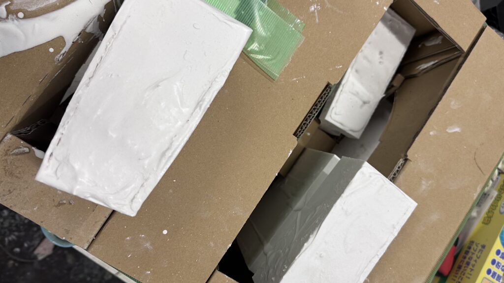 流し入れたはいいものの、型が自立しない場合があるので段ボールなどを適時有効活用しましょう。そのまま放置して固めていきます。