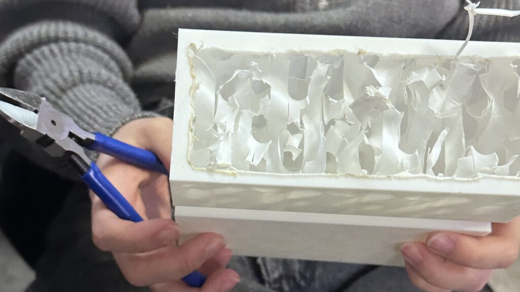 はんだごてとペンチを使って下の写真のように穴(?)をあけていきます。ぺりぺり。意外と力が必要で大変でした。