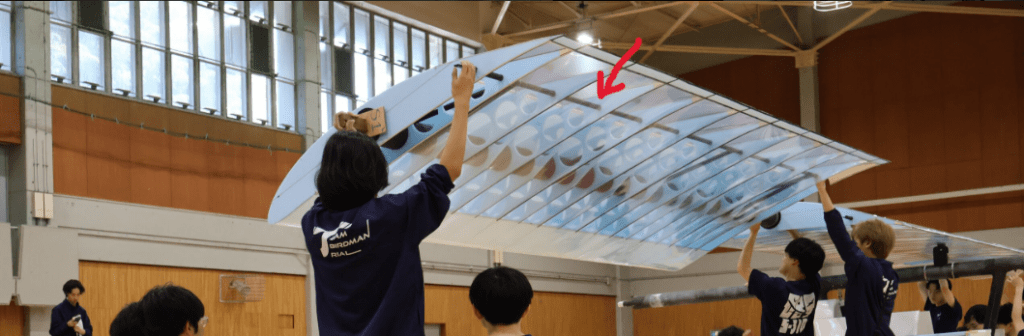 リアスパとは主翼の中に通っている、細い桁のことです。別名副桁とも言います。下の写真の赤い矢印でさしているのがリアスパです。