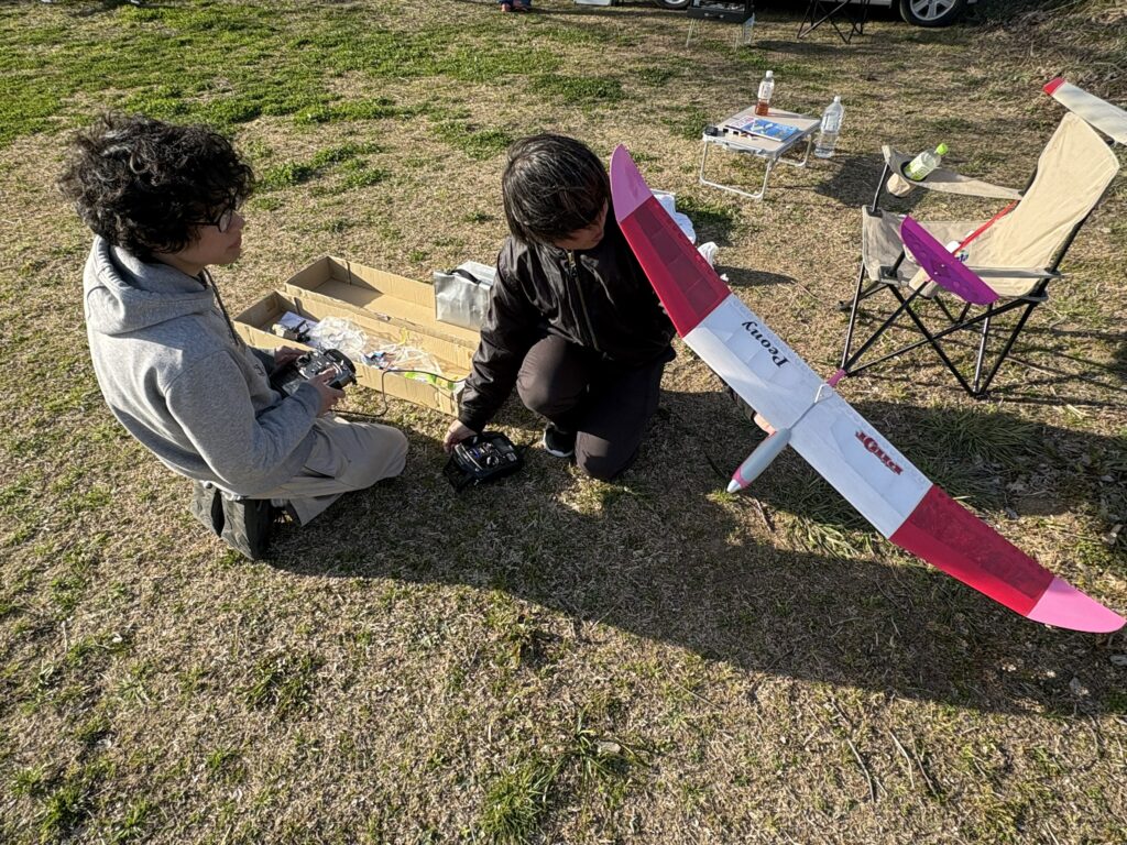 指導員の方の下、パイロットと二人で、部室から持ち込んだラダー機「Peony RED」の操縦練習を行いました!