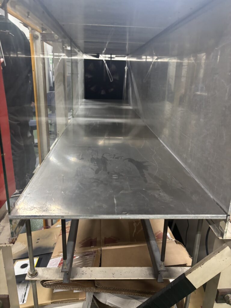 風洞はこのような装置でした。奥に巨大なファンが付いており、そこから一定の速度の空気が流れてきます。