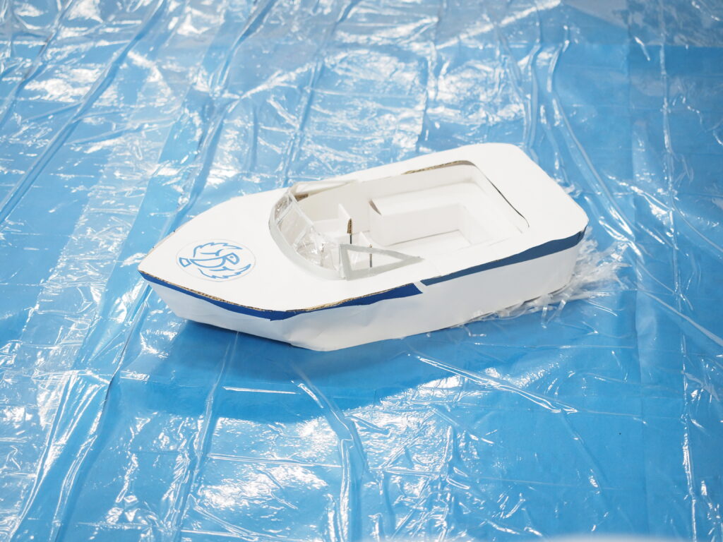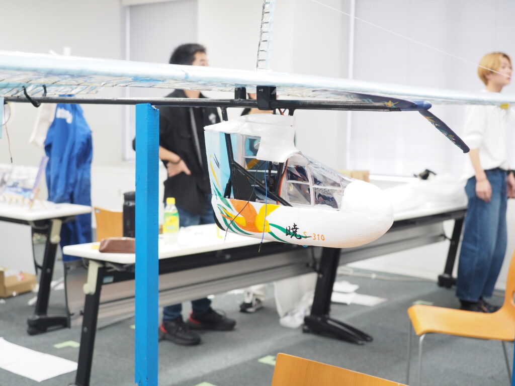 一時は完成が危ぶまれた模型でしたが、無事に完成し、展示することができました。模型は琵琶湖の上を飛んでいるように見せるため、青いシートの上に青い支柱を立て、その上に設置しました。また、大会時に並走するボートも制作し、細部にまでこだわりました。さらに、電装班の尽力により、実際にプロペラが回転する様子をお見せすることができました。