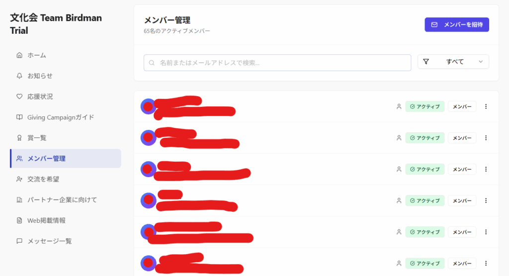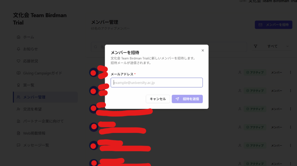 広報のメンバーしかダッシュボードへ登録していなかった我々は、慌ててメンバーを追加することにしたのですが、部員に招待メールを送信する際、以下の写真のように、一人ひとり手打ちでメールを送信する必要があることに気づきました、、、弊部は171人いるマンモス部です。到底人間ができる所業ではありません、、、