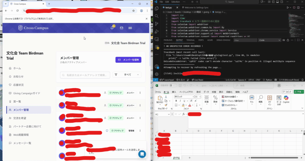 そこで、pythonのseleniumという、ウェブサイトを自動で操作できるフレームワークを活用して、Excelに登録されているすべての部員のidのメールアドレスに対して、招待を自動で送る仕組みを作ろうと考えました!