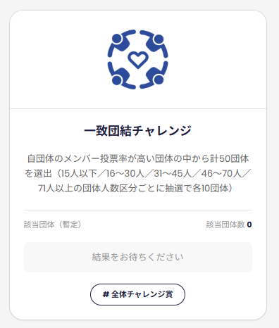 GivingCampaignの賞の一つに、「一致団結賞」という、登録部員数のうち何人が自団体に投票したかで決まる賞があります。