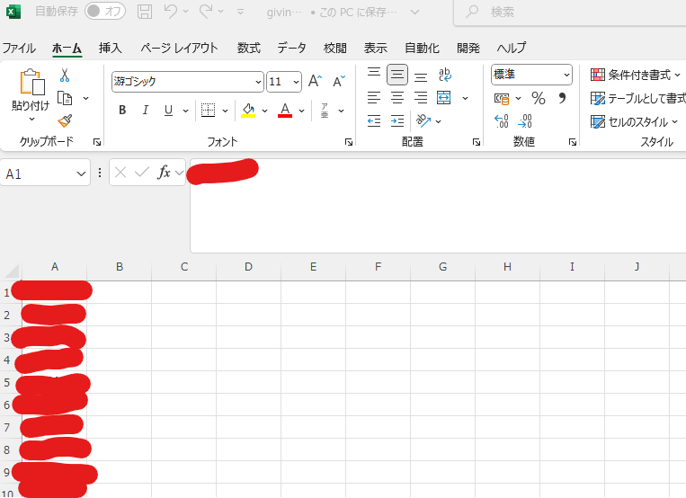 続いて、A列にメンバーのid(メールアドレスの@の前まで)が格納されたExcelファイルを作成し、CSV形式に変換します。ファイル名はgiving.csvにしました。