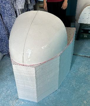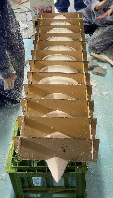 長年の弊班の課題として、制作精度の低さが指摘されていました。原因として、主材である55倍発泡スチロールの加工の難しさがあります。機体の形状は曲率が高く複雑な構造を持つため、過剰に削れることや左右のバランスが崩れてしまうことが頻発しました。また、完成した後も太陽の熱や自重による変形などの問題が存在していました。そのため、S-310ではパーツを丸ごと覆うサイズの型を採用し、複雑な曲率にも対応できるようにしました(図1)。また、パーツの製作途中に保護フィルムを貼るようにし、熱や自重による変形を極限まで抑えました。