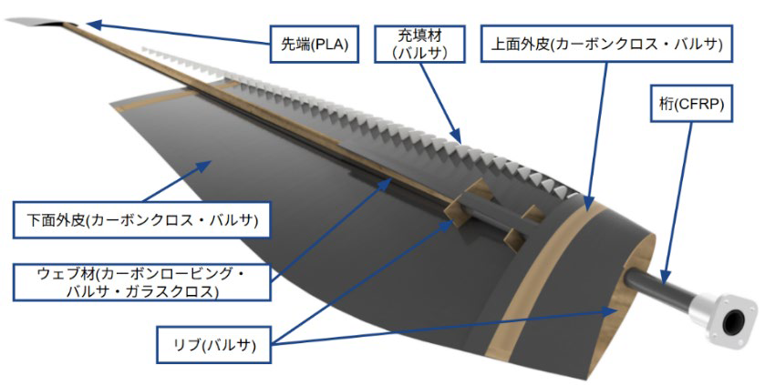 また、外皮には昨年までは24t材である198g/m^2の3Kカーボンクロスを使用していましたが、飛行時に外皮にかかる荷重に対して強度が過剰であると判断し、剛性が高く、軽量な40t材、45g/m^2の開繊カーボンクロスを使用することで剛性を低下させず、軽量化をすることができました。また、従来カーボンクロスの編み目の方向とプロペラのスパン方向が垂直になるように積層を行なっていましたが、外皮におけるねじれ伝達の効率化と根本部でのブレース構造による剛性向上を目的として、スパン方向に対して繊維が45度になるよう積層を行いました。