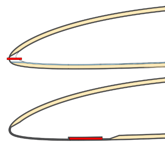 接着位置を前縁部からずらし、前縁精度の向上に努めました。空力的に前縁は最も重要ですが、昨年まで前縁部で外皮の接着を行なっており、接着時のずれによって再現性が落ちるという課題がありました。そのため、前縁部の14%の位置までを背側とし、一体成型することで、前縁部の精度向上に努めました(図3)。