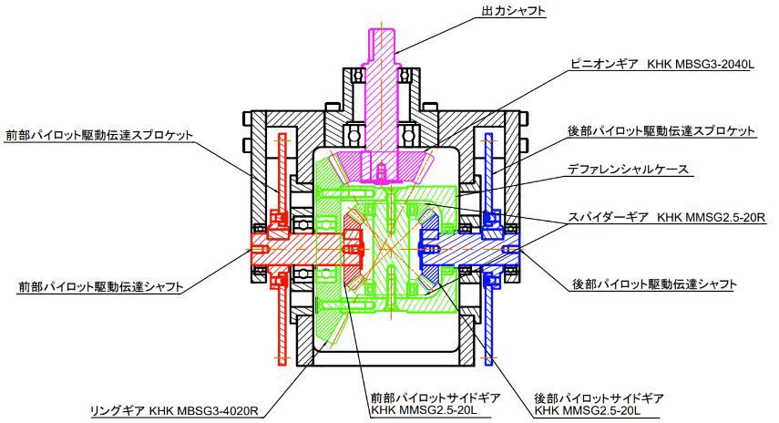 従来の駆動方式では、機構上プロペラを回転させるために前部クランクと後部クランクを同期して回転させる必要があり、2人のパイロットのケイデンスを一致させてペダリングする必要がありました。いずれか一方の回転が速すぎたり遅すぎたりすると抵抗が生じるため、両者の動作の同期性が極めて重要でした。差動装置であるデファレンシャルギアの逆入力を利用し、2人のパイロットのトルクを合成することで、クランクの同調を不要とし、より楽なペダリングを実現することを目的としています。