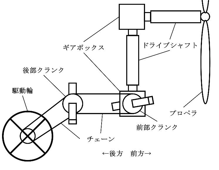 デファレンシャルギアを導入することで、発進時には後部パイロットが駆動輪及びプロペラの回転を、前部パイロットがプロペラの回転をそれぞれ担当することが可能となります。これにより、前部パイロットはプラットホーム上で機体が静止した状態でも、ペダリング動作によってプロペラを回転させることができます。