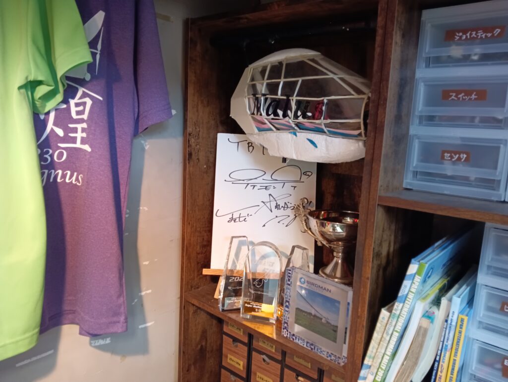 そして周りにあるのは、S-270Malusの模型と、鳥コンで3位入賞したときの優勝カップ、パイロットたちがママチャリグランプリというレースで賞を獲った時の楯です。