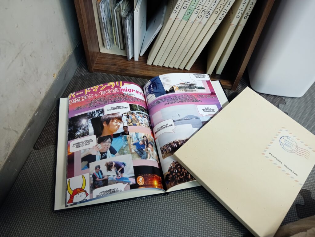 そして最後に、この棚の一番下にあるのは、TBTの歴代の先輩方の卒アルです。TBTでは毎年、4年生が学部を卒業する段階で、後輩がアルバムを作り、プレゼントしています。
