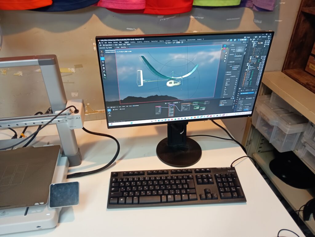 サムネに写っているのは、設計者たち愛用の高性能パソコンのモニタです。どうやら今は、blenderマスターのフェア設計が、書類用?に、S-320 Elementが琵琶湖で飛ぶ姿を、CGで再現している最中みたいです。