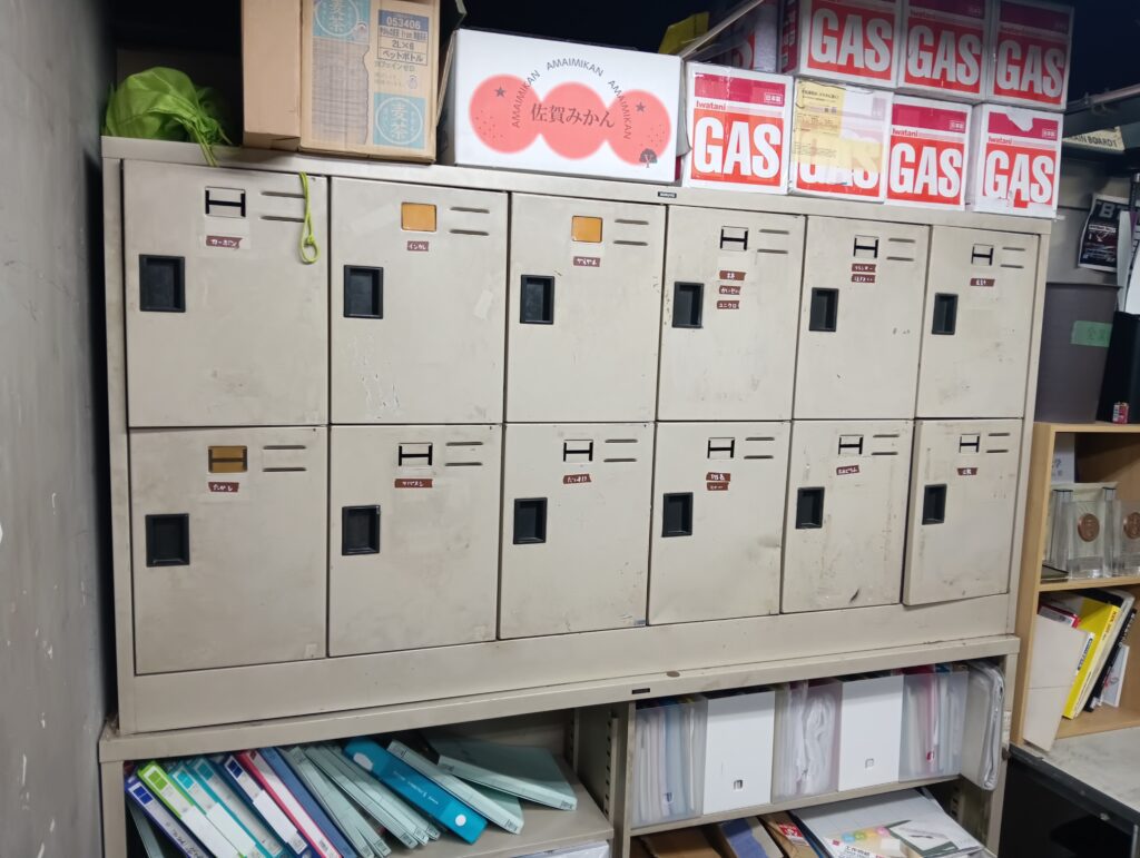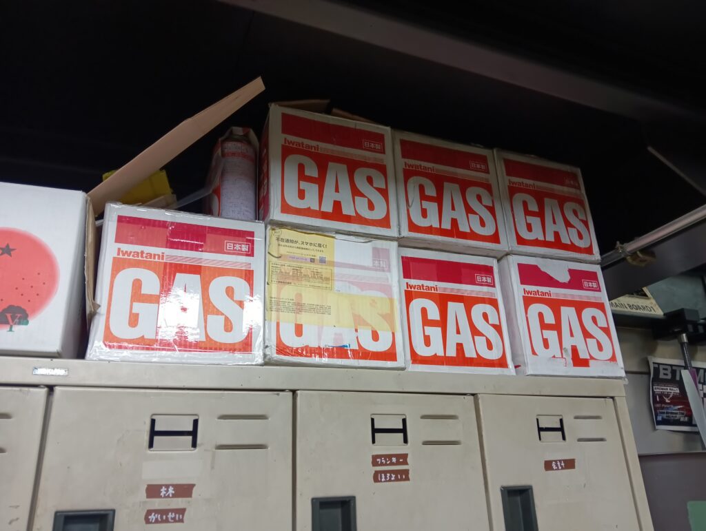 ロッカーの上に置かれてるのは、(見ての通り)GASです。TFは徹夜で行うので、真っ暗な中作業をするために、発電機や投光器が必要です。