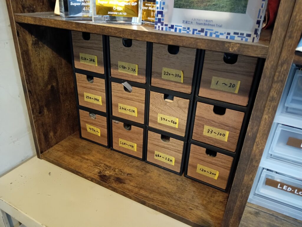 一番大変だったのが、こちらの抵抗です。抵抗値がバラバラなものが混ざった状態の塊が部室から複数見つかり、班員や後輩が、抵抗のカラーを見ながらものすごい時間をかけて分類してくれました。