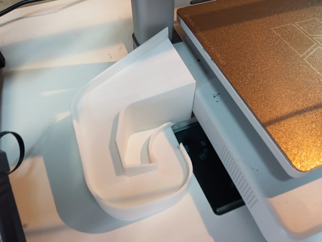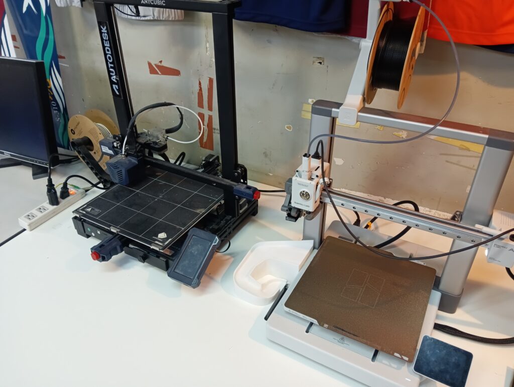 右は、今年新たに導入された、Bambu LabのA1です。このプリンター、樹脂のゴミを床に捨てる機能がついているのですが、放置しておくとそのまま床が樹脂だらけになってしまうので、
