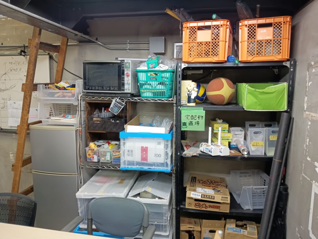 宅配物置き場や、部員が気分転換に使うスポーツ用品、テープやのりなどの消耗品、工具、掃除用品などのほか、冷蔵庫や電子レンジなどの生活家電(部費・活動費では購入していません)も完備しています。