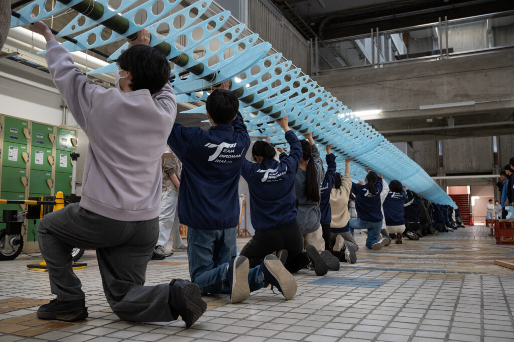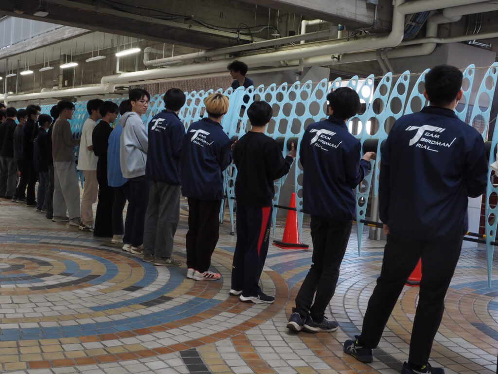 今年のTBTの翼の全長は40m!11個に分かれた翼を接合して、一つの長い翼にしていきます。この試験が成功するかによって来週の桁荷重試験ができるかがかかっているので、たくさんの人数で慎重に翼を繋げていきます。そして、